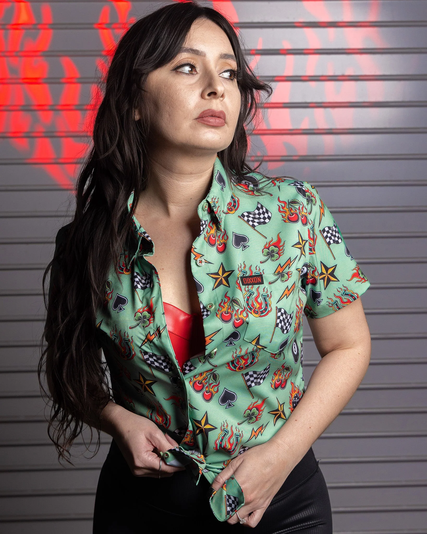 Turn up the nostalgia with the Women’s 1996 Party Shirt. Set on a mint green base with bold flaming cherries, lucky clovers, checkered flags, lightning bolts, and vintage tattoo-inspired graphics throughout, this style delivers playful edge with an easy, flattering fit.