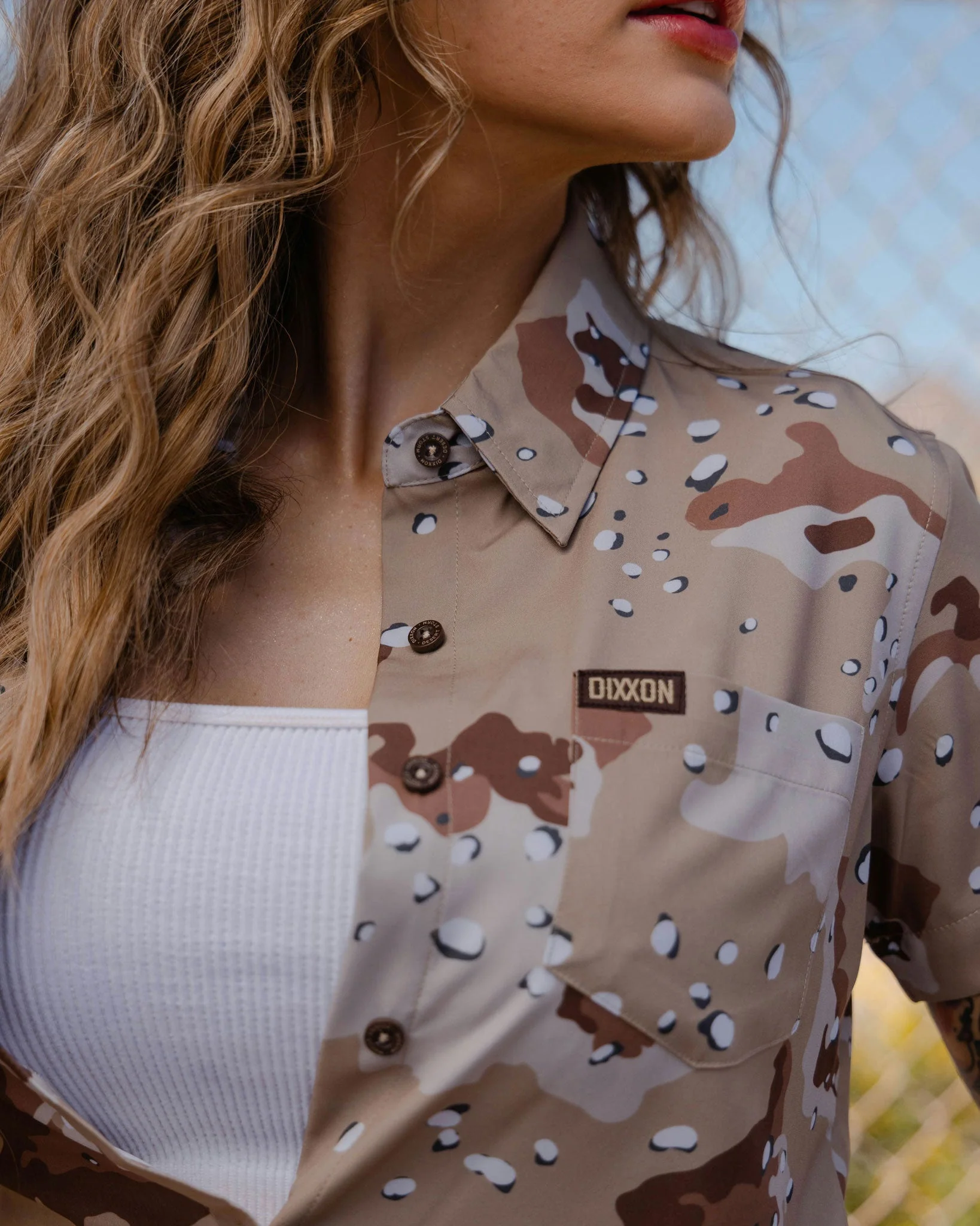 - Women's brown camo patterned short sleeve party shirt